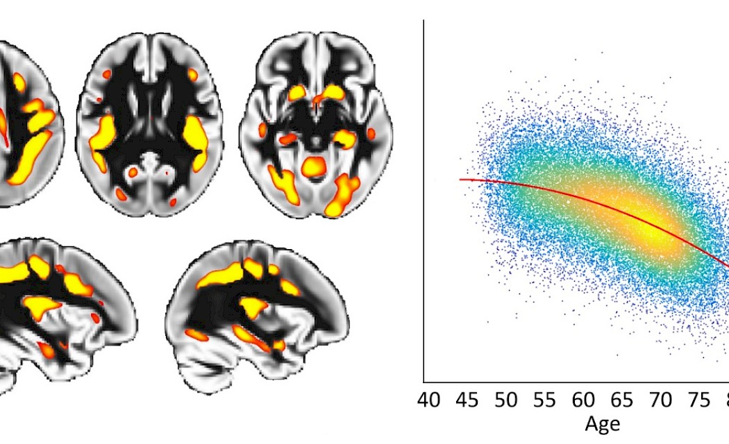 Pictured above: To the left of the figure, the red-yellow colour denotes the regions that degenerate earlier than the rest of the brain, and are vulnerable to Alzheimer’s disease. These brain areas are higher-order regions that process and combine information coming from our different senses. To the right of the figure, each dot represents the brain data from one UK Biobank participant. The overall curve shows that, in these particularly fragile regions of the brain, there is accelerated degeneration with age. Credit: G. Douaud and J. Manuello.