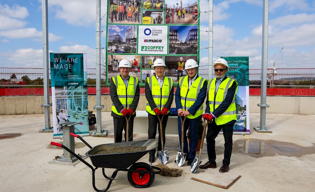 Above image: Members of the project team taking part in the rooftop ceremony. Left to right: Byron Byrne (Director, The Oxford Science Park), Yong Shen (Director, The Oxford Science Park), Robin Norman (Project Director, Mace), Jitesh Patel (Head of Development, The Oxford Science Park.